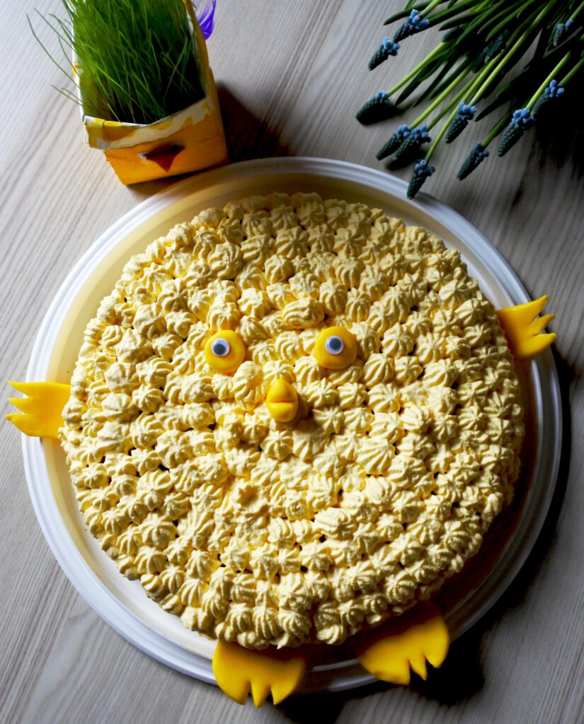 Prepare the frosting. Whisk the whipping cream into a foam and add the quark and sugar. Color the foam with yellow food coloring. Pipe the foam onto the cake. Add the chick’s decorations.