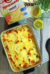 Peel and chop the onion into small cubes. Finely chop the cold-smoked salmon. Beat the eggs in a bowl and add the cream, cream cheese and black pepper.