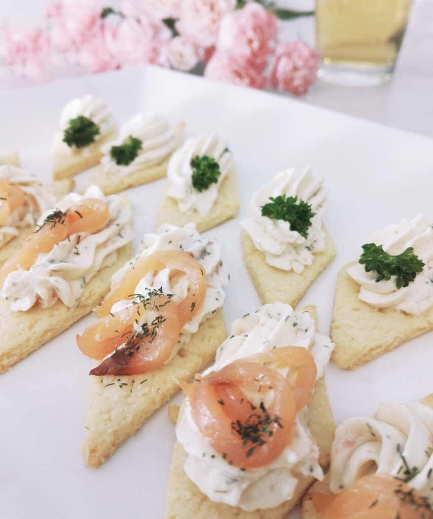 Mix all ingredients together, pipe the paste onto the cookies and garnish with dill.