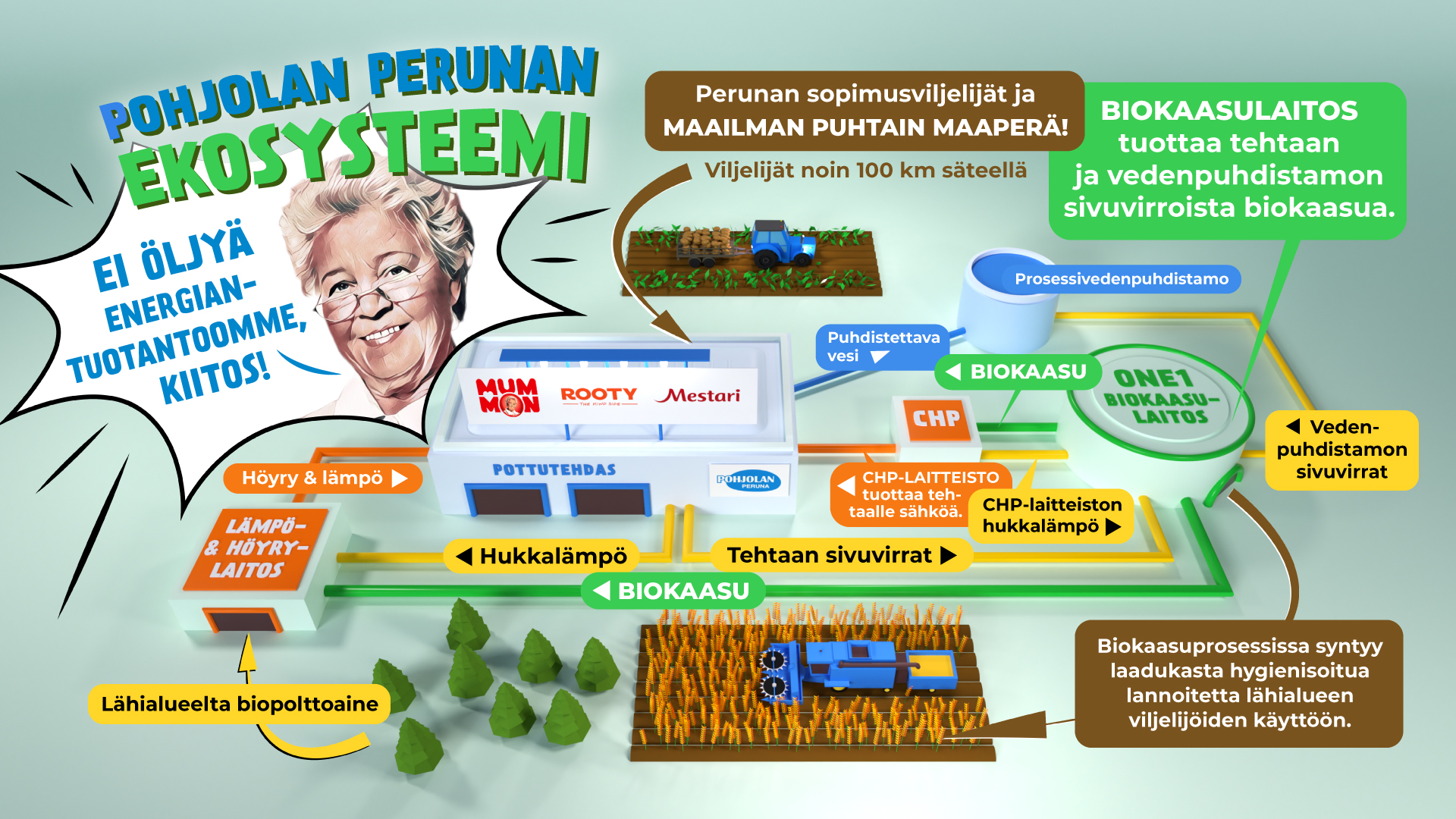 Mummon tehtaalla käsitellään ja jalostetaan perunaa n. 40 milj. kiloa vuodessa. Tuotannossa syntyy tuhansia tonneja ravinnepitoisia sivuvirtoja, jotka hyödynnetään tehokkaasti. Tuotannossa käytettävä energia tulee omasta biokaasulaitoksesta. Vastuullisesti tuotetun paikallisen energian määrä vastaa noin 600 000 litraa polttoöljyä vuodessa.