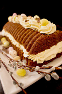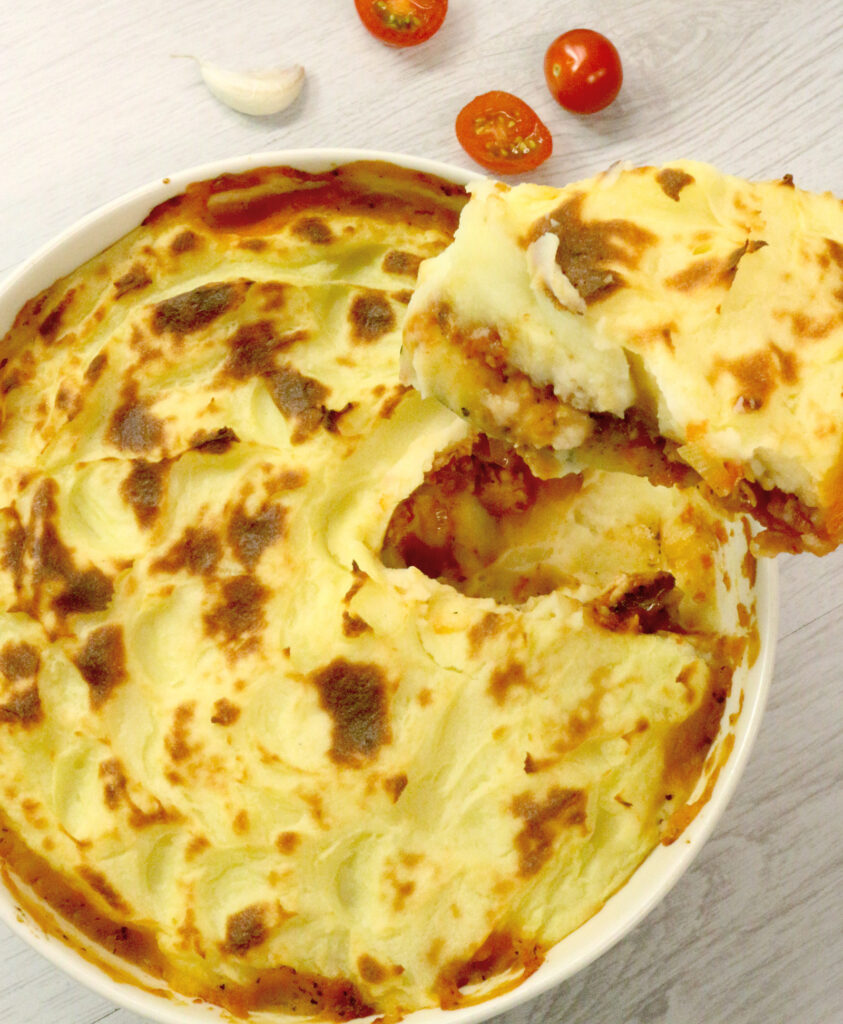 Kokoa laatikko noin 2 litran vuokaan. Levitä puolet perunamuusista voidellun vuoan pohjalle. Kaada lihaseos muusikerroksen päälle ja lisää loput muusista. Tasoita pinta ja paista 200 asteessa uunin keskitasolla noin 25 min.