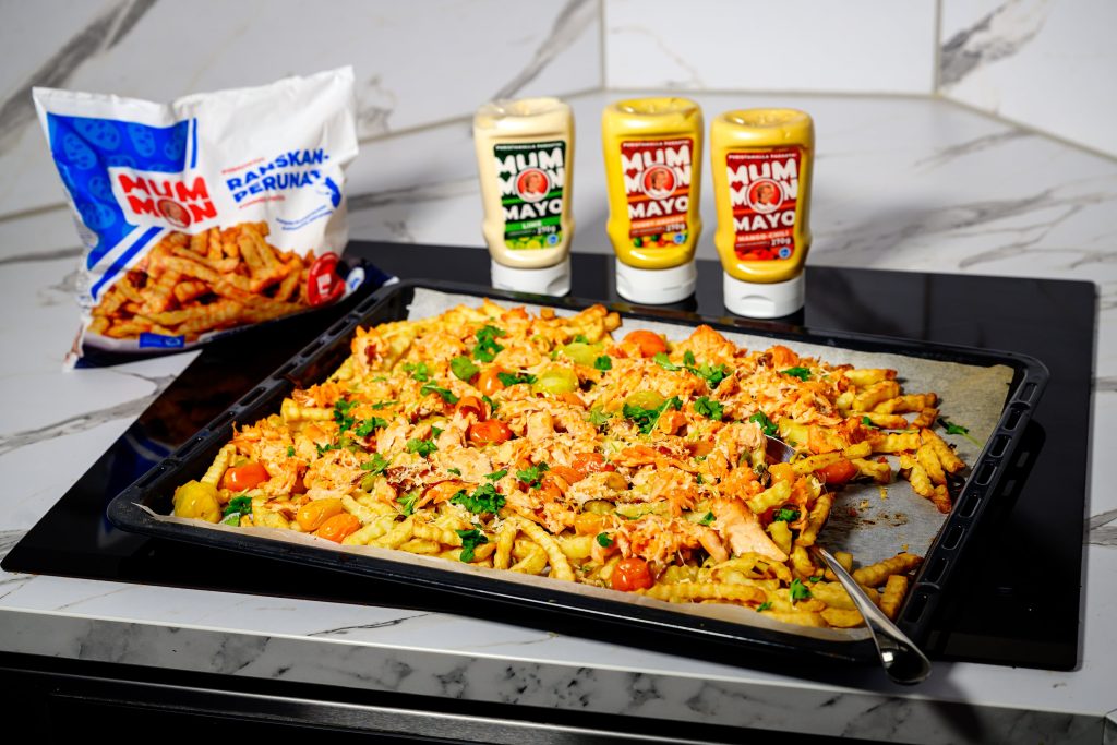 1. Laita Mummon Poimutetut Ranskanperunat leivinpaperilla vuoratulle uunipellille. Paista 225–250 asteessa ensin noin 10 minuuttia.