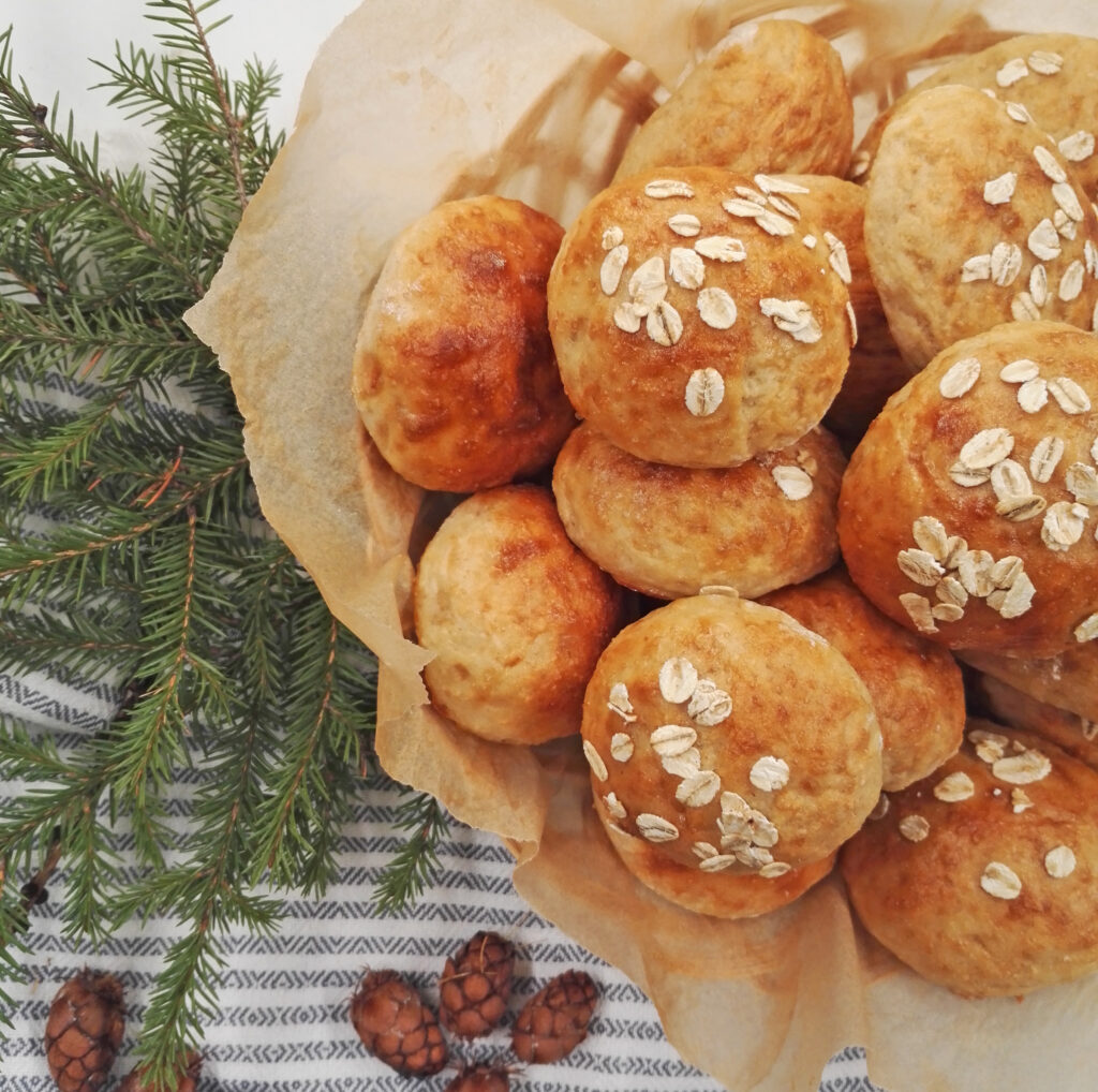 Jaa taikina kahteen osaan ja pyörittele ne tangoiksi. Leikkaa tangot 12 osaan ja nosta taikinapalat uunipellille leivinpaperin päälle. Anna kohota ja paista uunin keskitasolla 225 asteessa noin 10- 15 minuuttia.