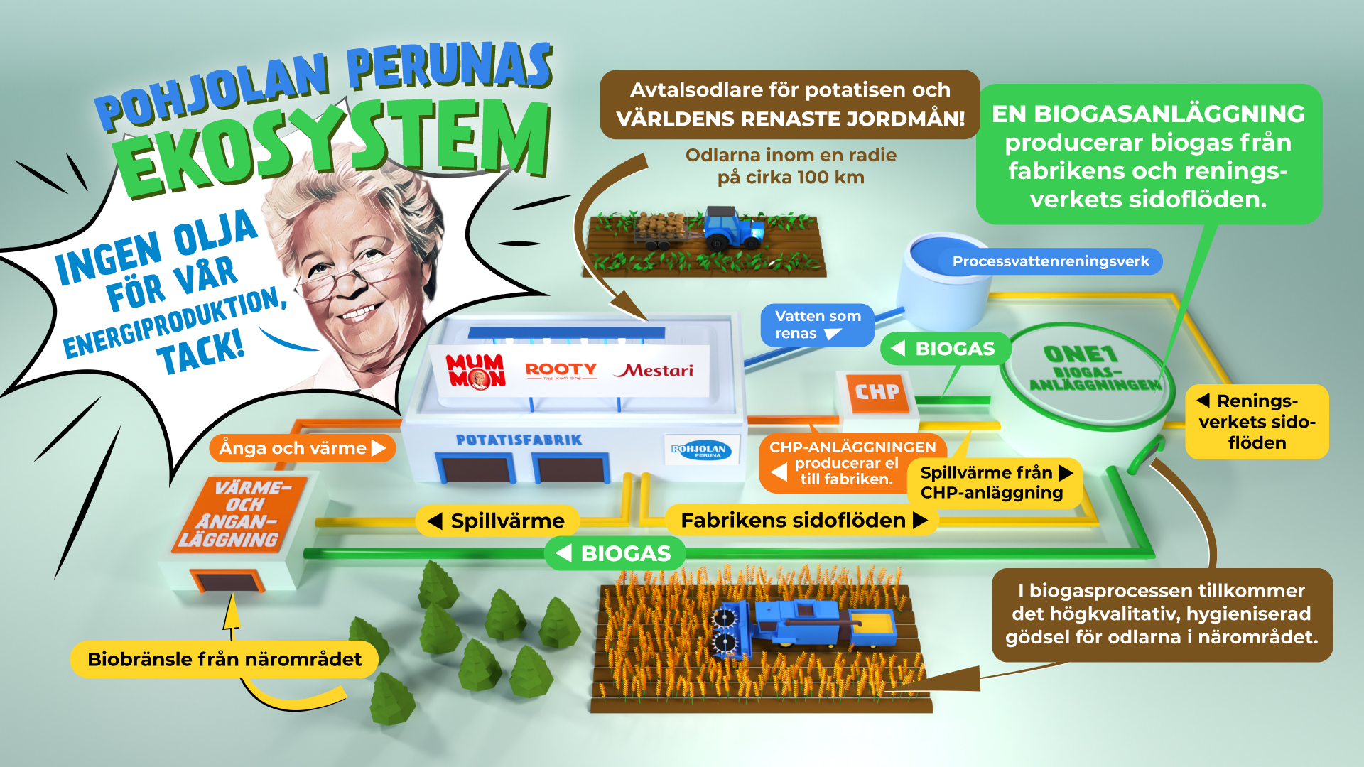 På Mummons fabrik bearbetas och förädlas potatis cirka 40 milj. kilo per år. I produktionen uppstår tusentals ton näringsrika sidoströmmar som utnyttjas effektivt. Den energi som används i produktionen kommer från vår egen biogasanläggning. Mängden lokalt producerad energi som producerats ansvarsfullt motsvarar cirka 600 000 liter eldningsolja per år.