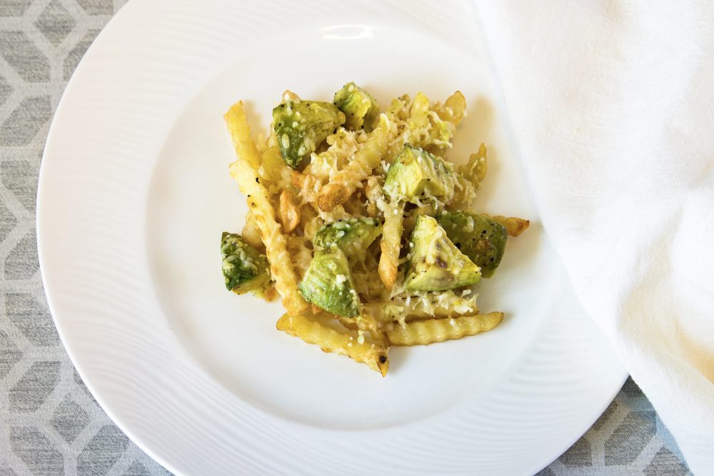 Stek potatisen enligt anvisningarna i cirka 15–20 minuter i 220 grader. Tillsätt avokadoerna och den rivna parmesanen först ungefär fem minuter innan tillagningstiden är slut.