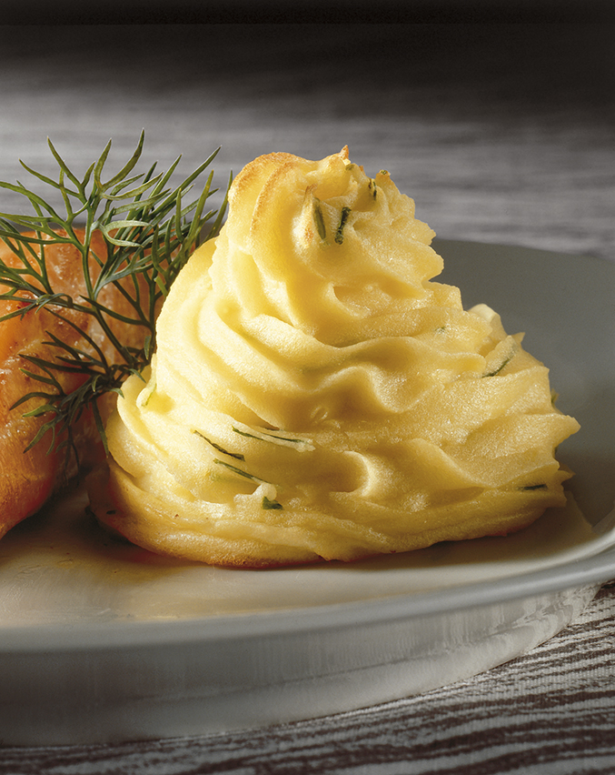 Koka upp vattnet. Ta kastrullen från spisen och tillsätt grädden. Tillsätt potatisflingor, äggula, salt, margarin och lite muskot. Blanda till en jämn degmassa.