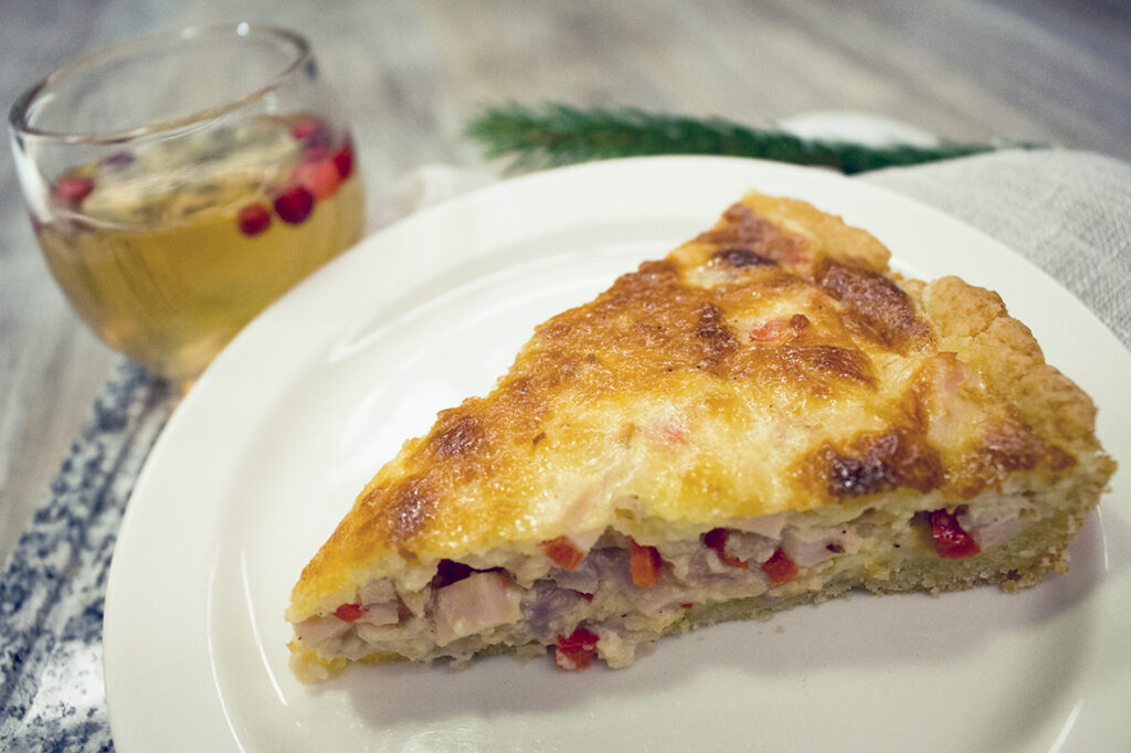 Tärna skinkan och paprikan. Finhacka löken. Blanda crème fraîche, äggen och kryddorna.