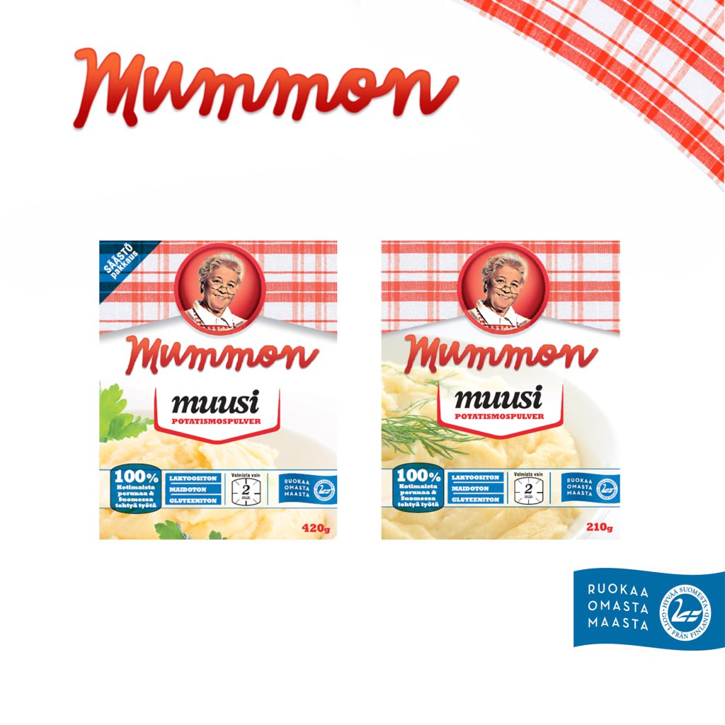 Samalla Mummon perinteisten muusien 210g ja 420g pakkaukset ovat päivittyneet. Tunnistat ne edelleen Mummon logosta ja ruutukuviosta.