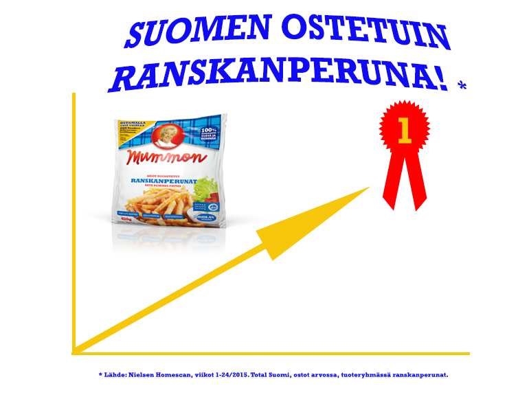 Mummon ranskalaiset ovat nousseet vuonna 2015 Suomen ostetuimmiksi ranskanperunoiksi! ( Lähde: Nielsen Homescan, viikot 1-24/2015. Total Suomi, ostot arvossa, tuoteryhmässä ranskanperunat).